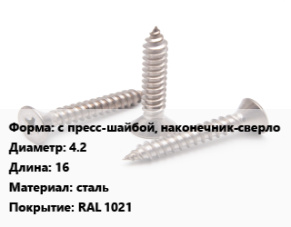 Саморез с пресс-шайбой, наконечник-сверло D=4.2 L=16 сталь RAL 1021, кг, для металла цена от 101.59 ₽ / кг, где купить, условия доставки в Воронеже и Воронежской области