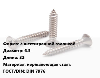 Саморез с шестигранной головкой D=6.3 L=32 нержавеющая сталь ГОСТ: DIN 7976