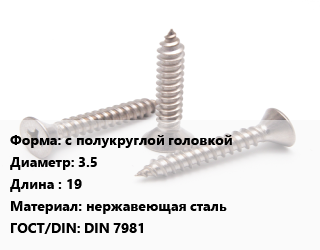 Саморез с полукруглой головкой D=3.5 L=19 нержавеющая сталь ГОСТ: DIN 7981