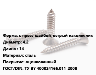 Саморез с пресс-шайбой, острый наконечник D=4.2 L=14 сталь оцинкованный ГОСТ: ТУ BY 400024166.011-2008