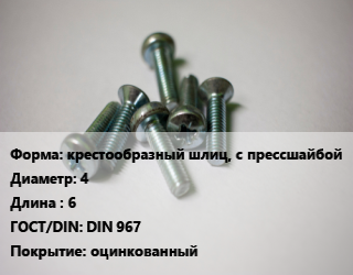 Винт крестообразный шлиц, с прессшайбой 4х6 DIN 967 оцинкованный