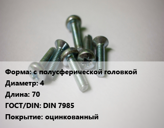 Винт с полусферической головкой 4х70 DIN 7985 оцинкованный, цена за 1000 шт,цена за шт, кг цена от 650.12 ₽ / кг, где купить, условия доставки в Воронеже и Воронежской области