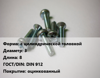 Винт с цилиндрической головкой 3х8 DIN 912 оцинкованный, 8.8, кг цена от 20.59 ₽ / кг, где купить, условия доставки в Воронеже и Воронежской области